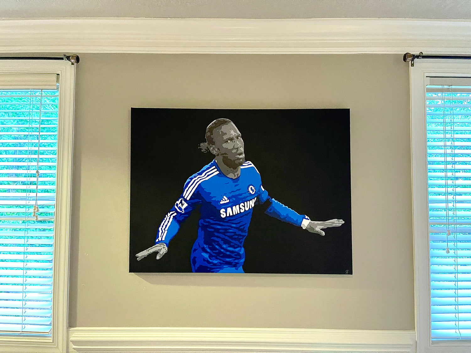 One of the greatest premier league strikers of all time. This painting depicts Drogba's iconic celebration that fans have seen time and time again. This piece was created in 2023.