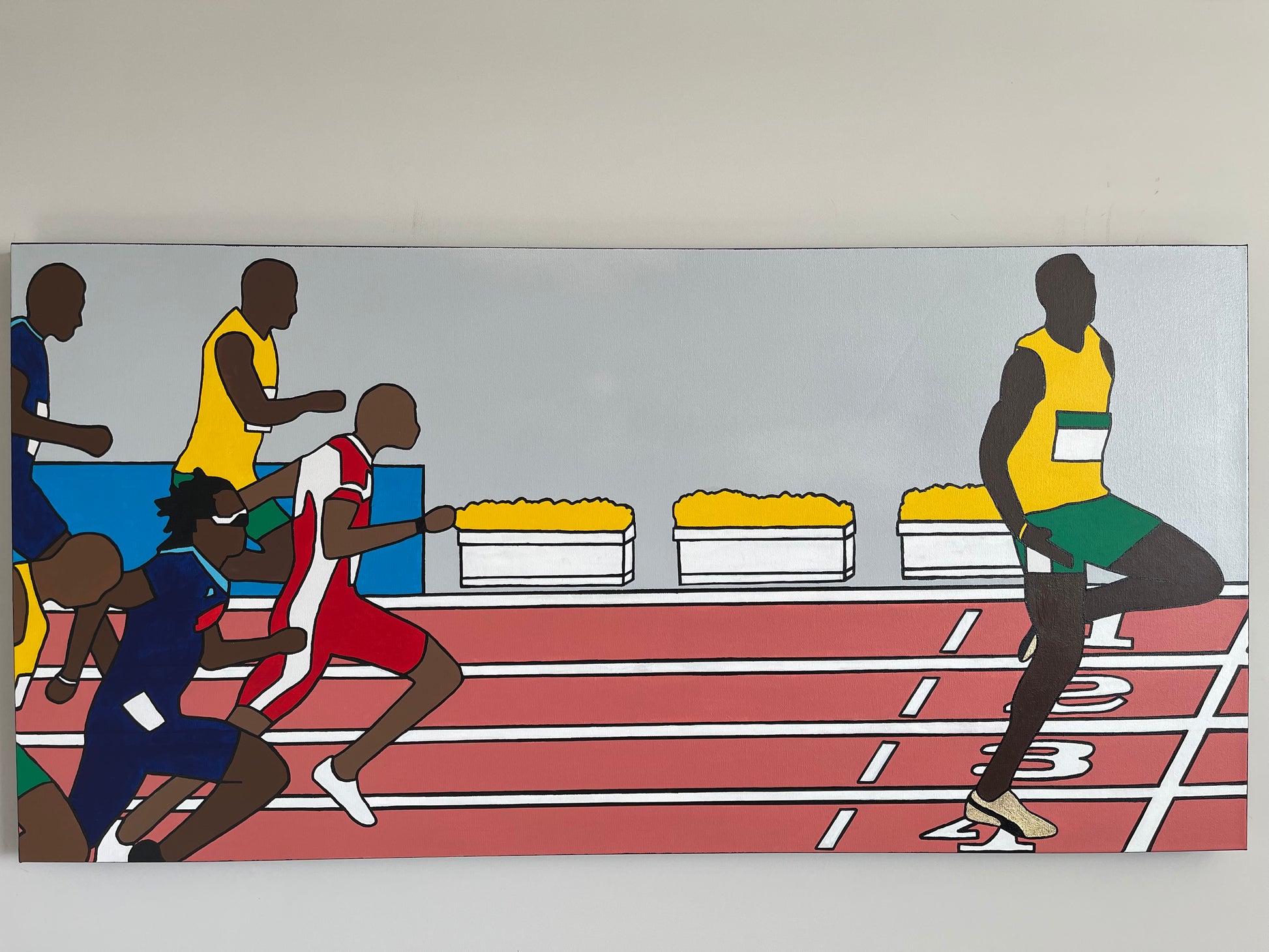 This 2x4 ft hand-painted acrylic piece captures the electrifying moment Usain Bolt crossed the finish line and beat his chest in celebration during his legendary 100m run. A tribute to unmatched speed and showmanship, the artwork radiates energy — with Bolt at center stage. His shoes, finished in gold foil, symbolize the new record he set on the world stage.